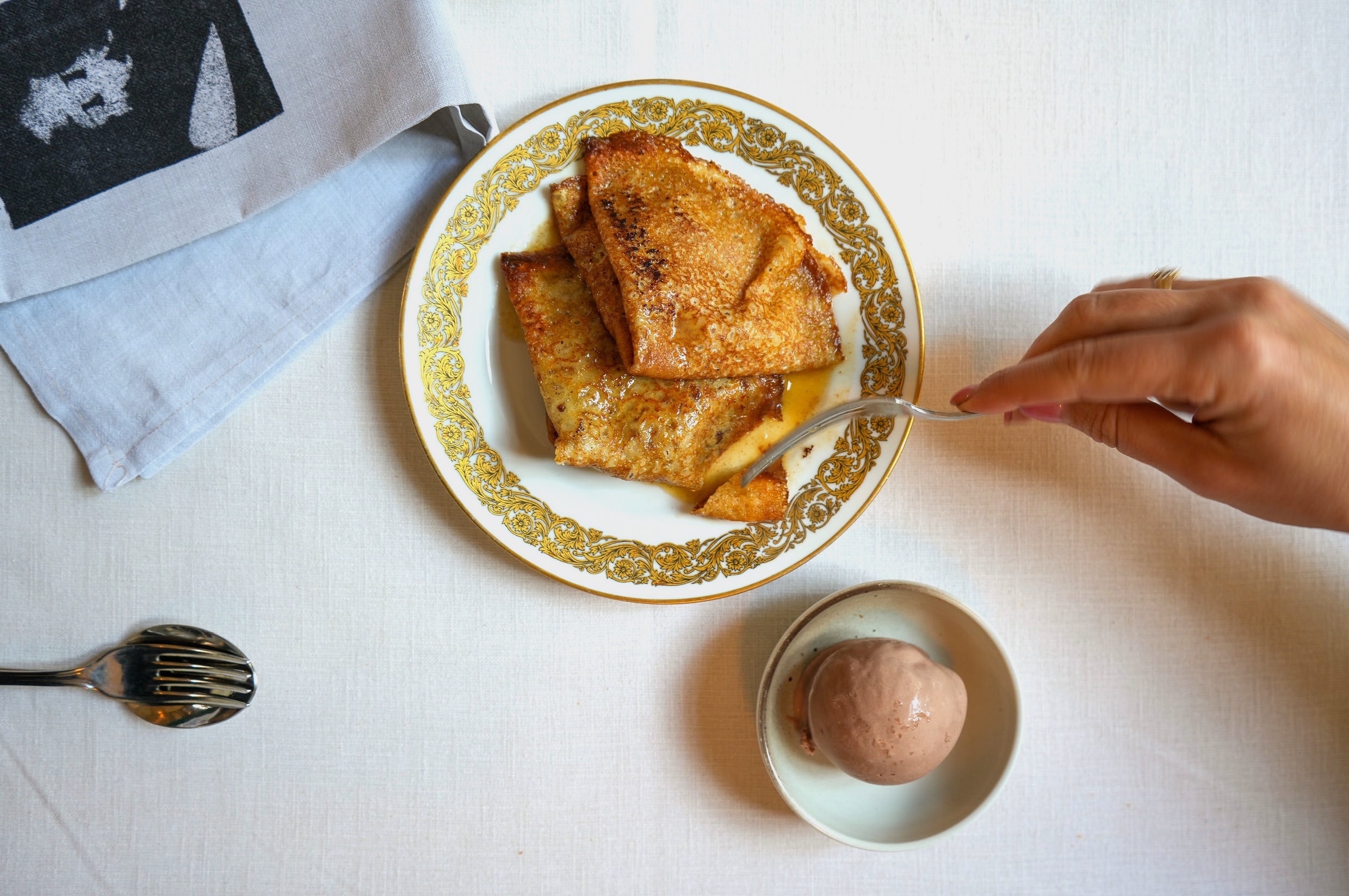 Bij binnenkomst in Le Cornichon voel je meteen de oude Parijse ziel van de plek. Het interieur, ontworpen door Laure Gravier en Soizic Fougeront van het bureau Claves, straalt een stijlvolle nostalgie uit. De groene fluwelen banken, chromen skai-stoelen en decoratieve friezen van rookmotieven herinneren aan de klassieke Parijse cafés, maar met een modern randje. Bertrand en Paul haalden hun inspiratie uit de iconen die te zien zijn in oude documentaires van het Institut National de l’Audiovisuel (INA). Met deze inspiratie en een pak passie, creëerden ze een plek waar vaste waardes en moderniteit op hun mooist samenkomen, en waar het oude Parijs volledig herleeft. De vinyl banken kunnen worden verschoven voor spontane dansavonden, terwijl de grote klassiekers van de Franse keuken terugkomen in het wekelijkse menu. Onder leiding van chef-kok Bertrand Chauveau, die zijn expertise opdeed in Michelin-sterrenrestaurants zoals Le Grand Restaurant van Jean-François Piège, biedt Le Cornichon een menu dat zowel eenvoudig als verfijnd is. Het weekmenu wisselt regelmatig en is een eerbetoon aan de klassiekers van de nationale keuken, maar met een moderne twist. Gasten kunnen genieten van zowel een rustig ontbijt als een snelle lunch of een uitgebreid diner, met klassieke gerechten op hun best bereid. De keuken weerspiegelt de waarden van Bertrand en Paul: de vreugde van het samenzijn, de liefde voor eenvoudige maar hoogwaardige ingrediënten, en het plezier van eten dat met zorg is bereid.