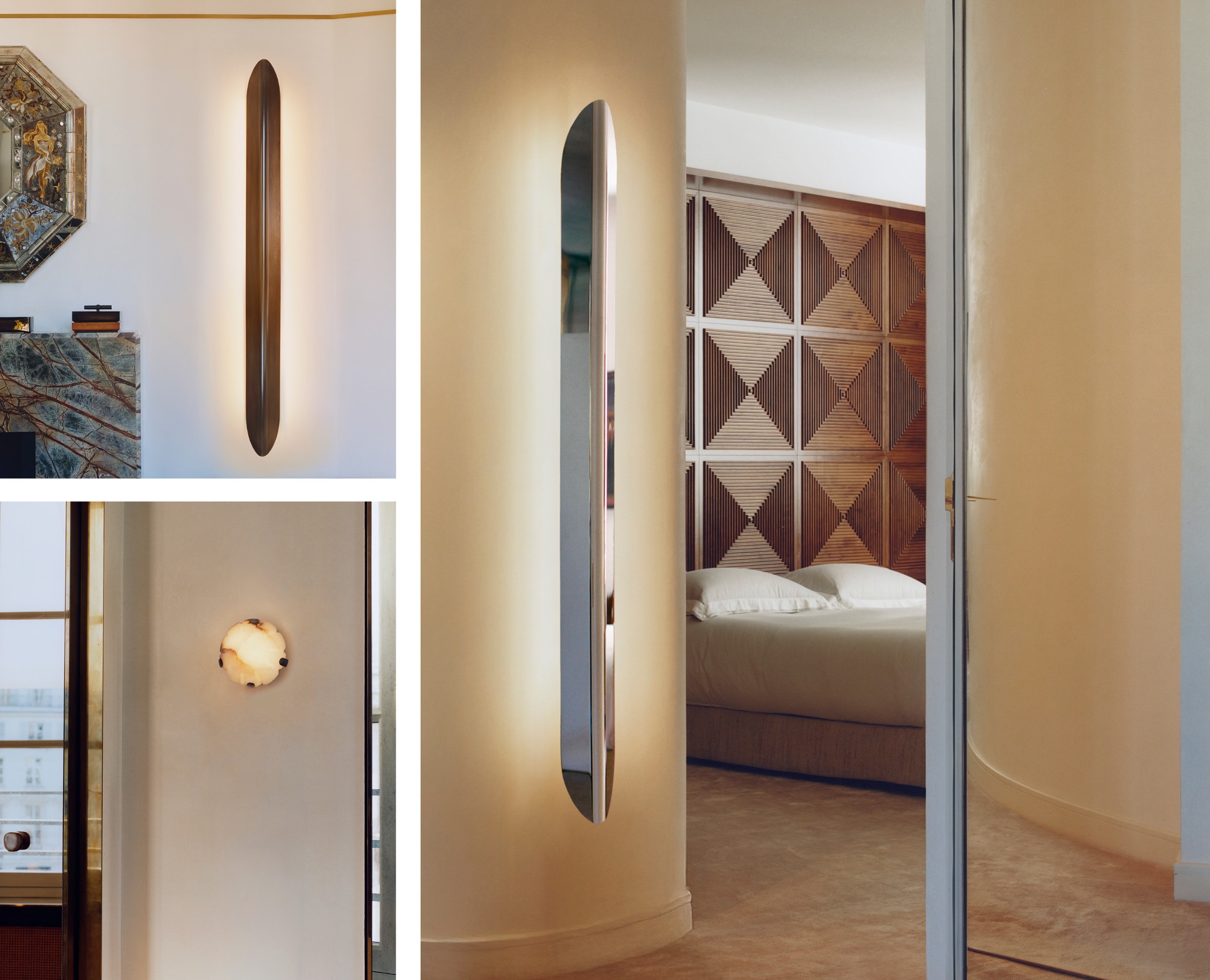 Zo is er de Uplight, een vloerlamp in gepatineerd messing met een verborgen kabel die in het lichaam van de lamp kan worden opgeborgen. Ten tweede is er de Jelly Fish, oorspronkelijk ontworpen voor een Parijse restaurant, dat zacht licht verspreidt doorheen organisch gevormd albast. De wandlamp Pat & John is dan weer opgebouwd als een messcherpe verticale vorm die indirect licht laat spelen over de muur. En ten slotte is er de Booklight: een subtiele, platte lamp die zich tussen boeken in een kast nestelt en deze van binnenuit verlicht — een ontwerp dat even eenvoudig als vindingrijk is.