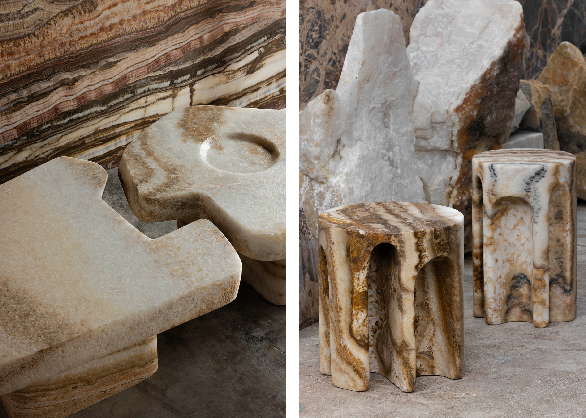 Aan de basis van de tentoonstelling staan materialen als onyx en travertin. In een reeks tafels, lampen en consoles wordt hun gewicht, textuur en kleur voelbaar. De YABA-koffietafel verschijnt in twee nieuwe versies: in zeeschuimgroen en amberkleurige onyx, waarbij het materiaal zelf de compositie bepaalt. De CANALA-console in wit travertijn brengt licht en structuur, terwijl de KOSIS-lamp doet denken aan een rots die zo uit een klif lijkt te zijn losgekomen. Elk object lijkt rechtstreeks van de natuur tot bij ons te zijn beland en doet wegdromen naar betere oorden.