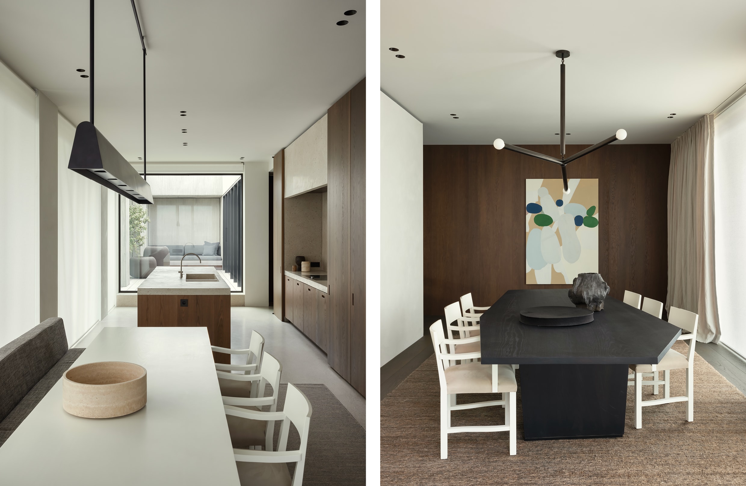 De woonkamer baadt in het natuurlijke licht en wordt verankerd door een sfeervolle open haard. De keuken ligt aan de achterzijde van het penthouse, naast de ruime achterpatio, en is uitgevoerd met warme houtaccenten en natuurlijke materialen die het binnen- en buitenleven naadloos verbinden. De eetruimte, strategisch geplaatst naast de bibliotheek, vormt het perfecte decor voor hedendaagse kunst en combineert cultuur met comfort. De bibliotheek zelf is het hart van het huis en verbindt de leefruimtes met de master suite en gastenkamers, wat een vloeiende en serene beleving creëert. Het materiaalgebruik is een meesterlijke balans: terrazzo, hout en pleisterwerk zorgen voor een kalme en tastbare sfeer. Op maat gemaakte VVDA-meubels worden gecombineerd met iconische vintage stukken, waardoor een elegante en toch gezellige ruimte ontstaat.