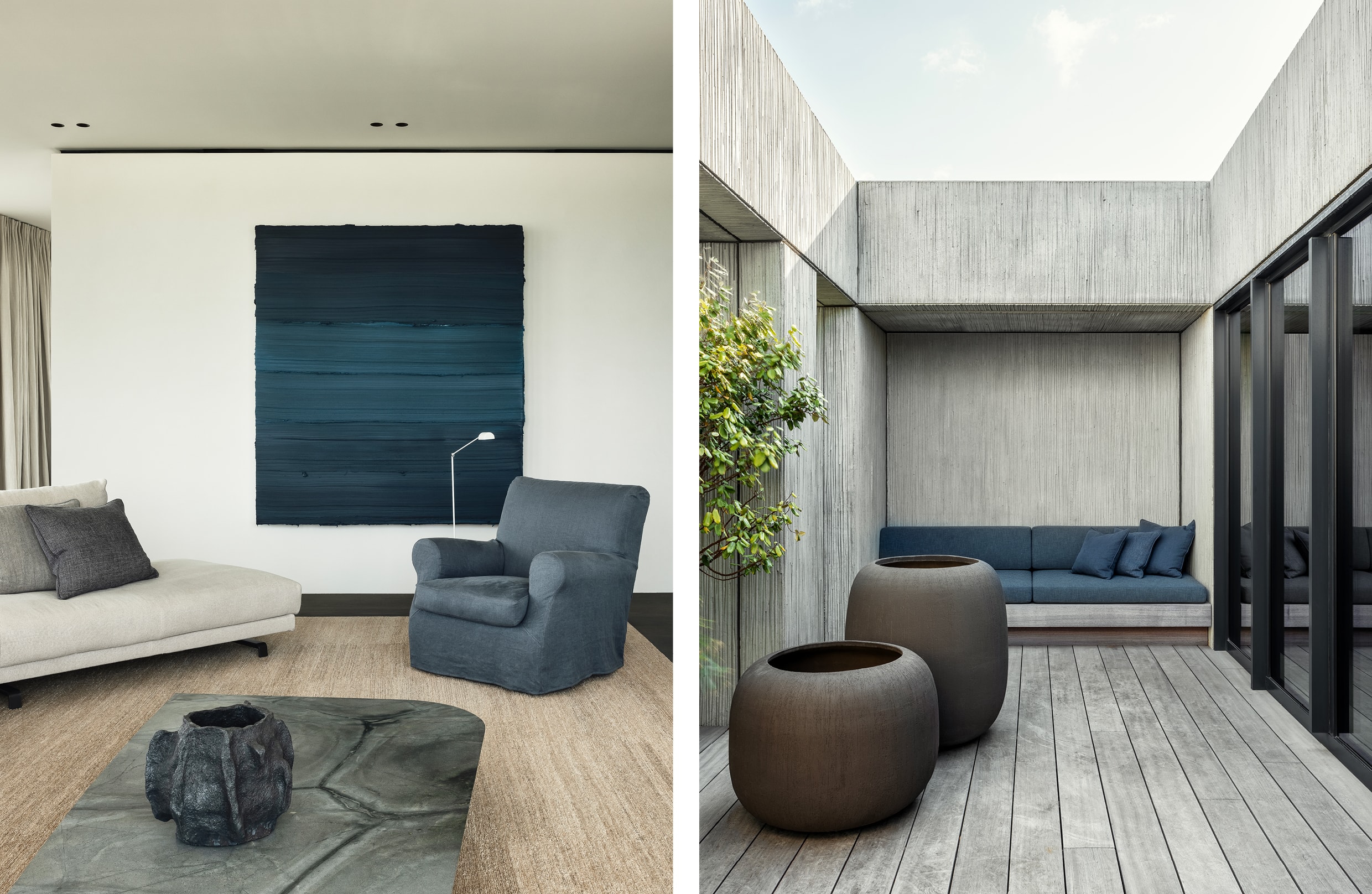 Aanvankelijk was het project bedoeld als twee aparte appartementen, maar het programma evolueerde tot één royaal penthouse van 365 vierkante meter, met daarbovenop 160 vierkante meter aan terrassen. De indeling biedt een perfecte balans tussen optimale functionaliteit en comfortabel wonen, waarbij de patio’s een centrale rol spelen. De kleinere voorste patio met een boom zorgt voor een vredige ontsnapping, terwijl de grotere, overdekte achterpatio het woongenot verlengt naar buiten. De overhangende veranda en overvloedige beplanting waarborgen privacy en creëren een intieme buitenruimte.