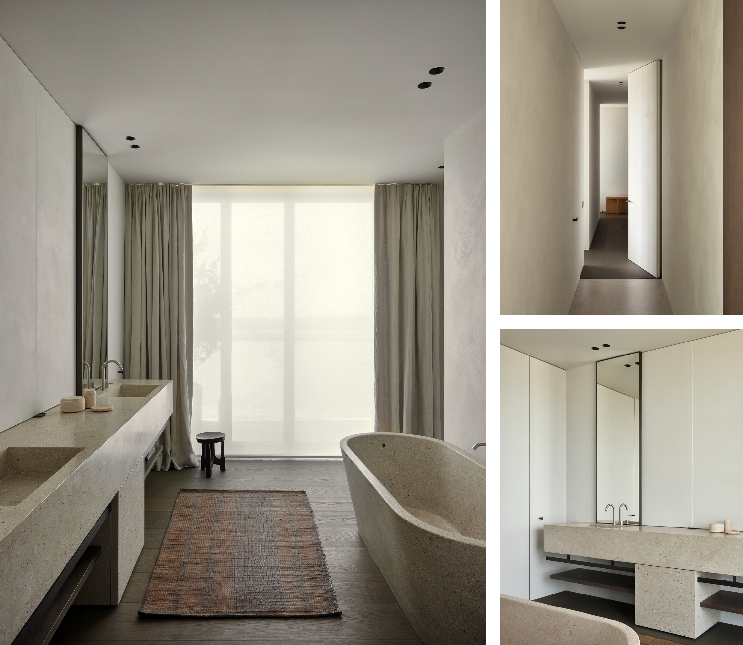 “Materiaalgebruik als een meesterlijke balans tussen terrazzo, hout en pleisterwerk voor een serene ambiance.”