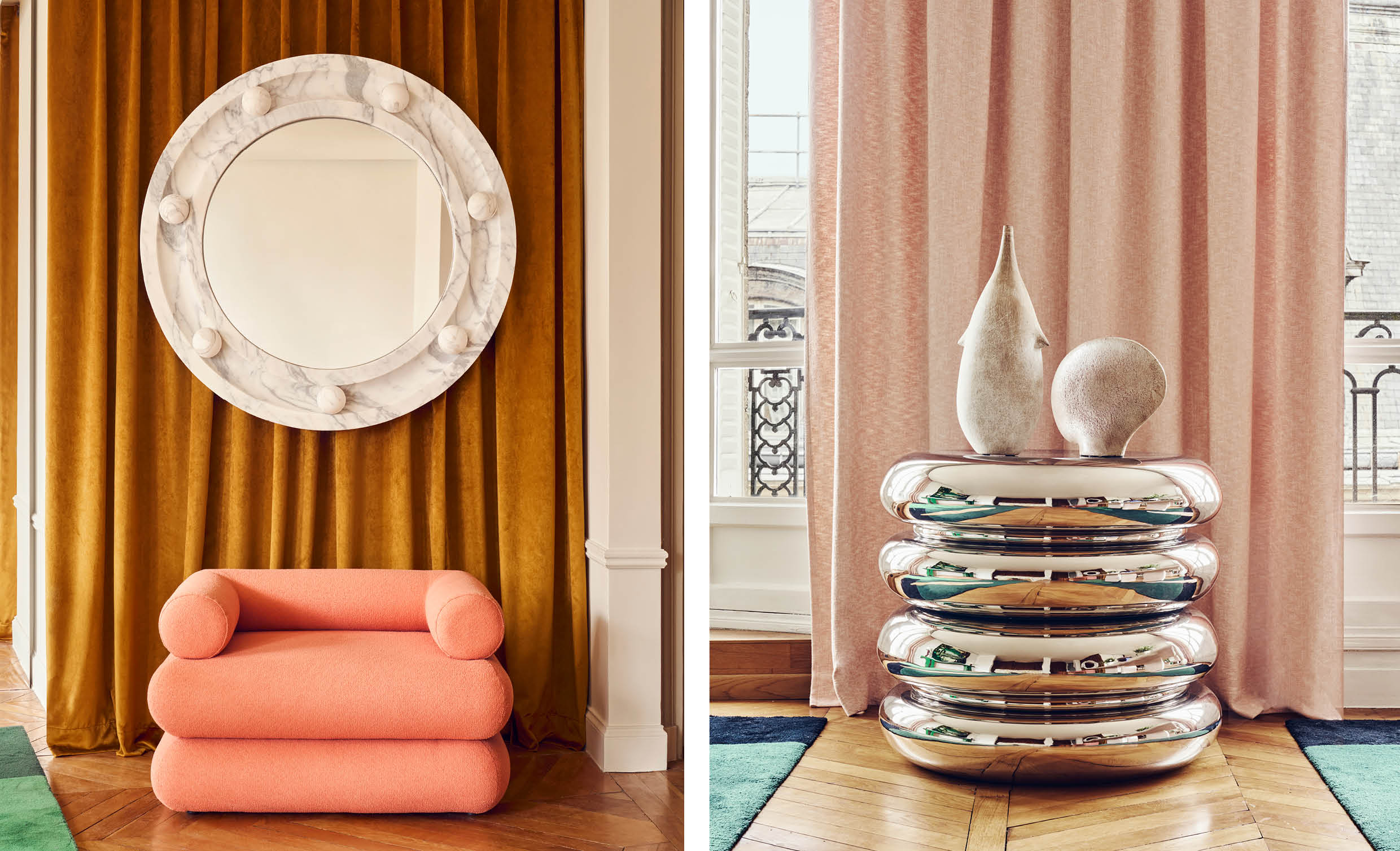 Boven de bomen van de Place de la Sorbonne ontvouwt Fleur Delesalle haar nieuwste creaties. Haar werk straalt kleur en zachtheid uit, voortbordurend op de neo-klassieke inspiratie die haar handtekening is geworden. De ontwerpen balanceren tijdloze elegantie met een speelse, moderne toets en nodigen uit tot een betoverende ervaring waarin kunst en design samenkomen. Haar palet refereert aan de levendigheid van de natuur: diepe groene tinten, stralend geel, zachte roze nuances, marmerstructuren en glanzend chroom. Deze elementen vinden hun vorm in imposante objecten, zoals een extra large spiegel, een extra long console en een extra round voetstuktafel. In de lucht blijft een lichte speelsheid hangen, alsof Lewis Carroll en Alice om de hoek staan: Fleur Delesalle in Wonderland.
