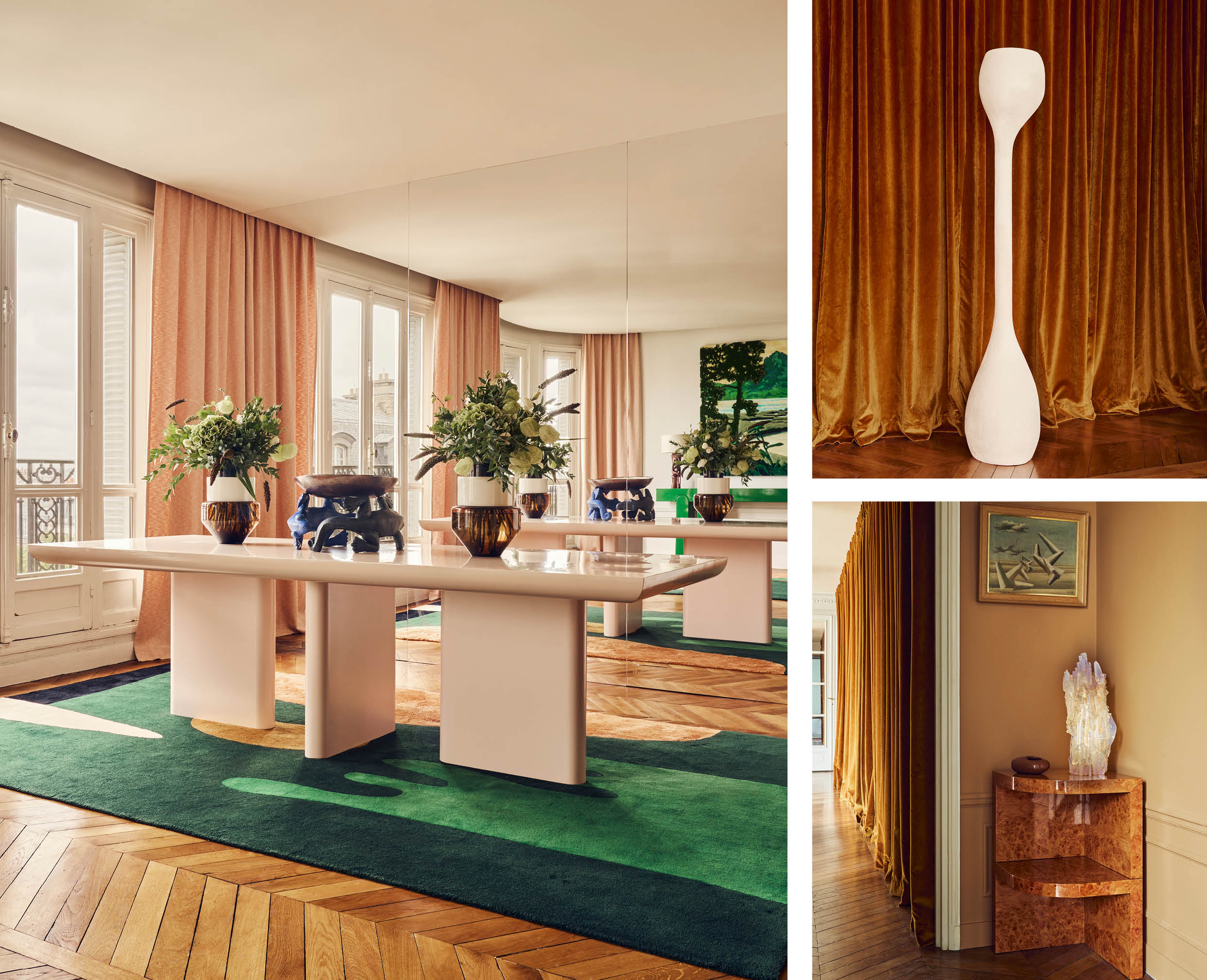 Haar recente creaties tonen een uitgesproken aandacht voor sculpturale vormen en schaal. De extra large spiegel vangt licht en reflectie, terwijl de extra long console een lineaire elegantie toevoegt die een ruimte onmiddellijk transformeert. De ronde voetstuktafel fungeert als een centraal element, subtiel humoristisch en tegelijkertijd monumentaal, en draagt bij aan de narratieve kracht van het geheel. Samen met bijdragen van kunstenaars als Manon Daviet, Antoine Duruflé en Heloise Piraud ontstaat een universum waarin interieurontwerp een dialogische ervaring wordt.