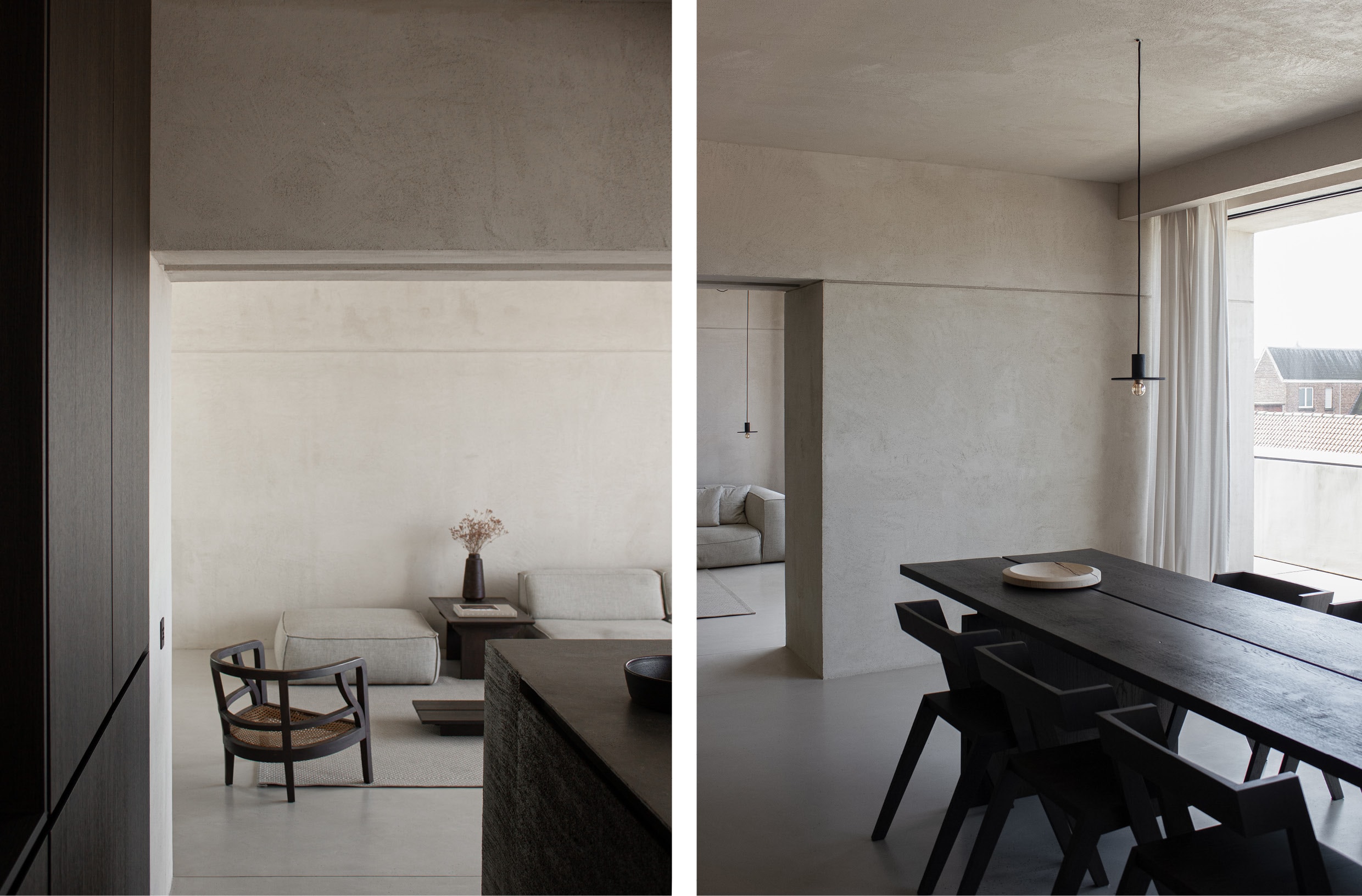 Penthouse VV ligt als een stil toevluchtsoord boven de daken van Gent. Vanop dit gerenoveerde dakappartement ontvouwt zich een panorama van torens en gevels, maar binnen heerst rust. De bewoners wilden een meditatieve plek die zich afkeert van de drukte van de stad, zonder het uitzicht te verliezen. Twee aaneengrenzende, donkere panden – een oude studio en een kleiner appartement – vormden de uitgangssituatie. Met de toelating om beide eenheden te verenigen, ontstond een complex maar inspirerend project: een zoektocht naar licht, stilte en architecturale helderheid.