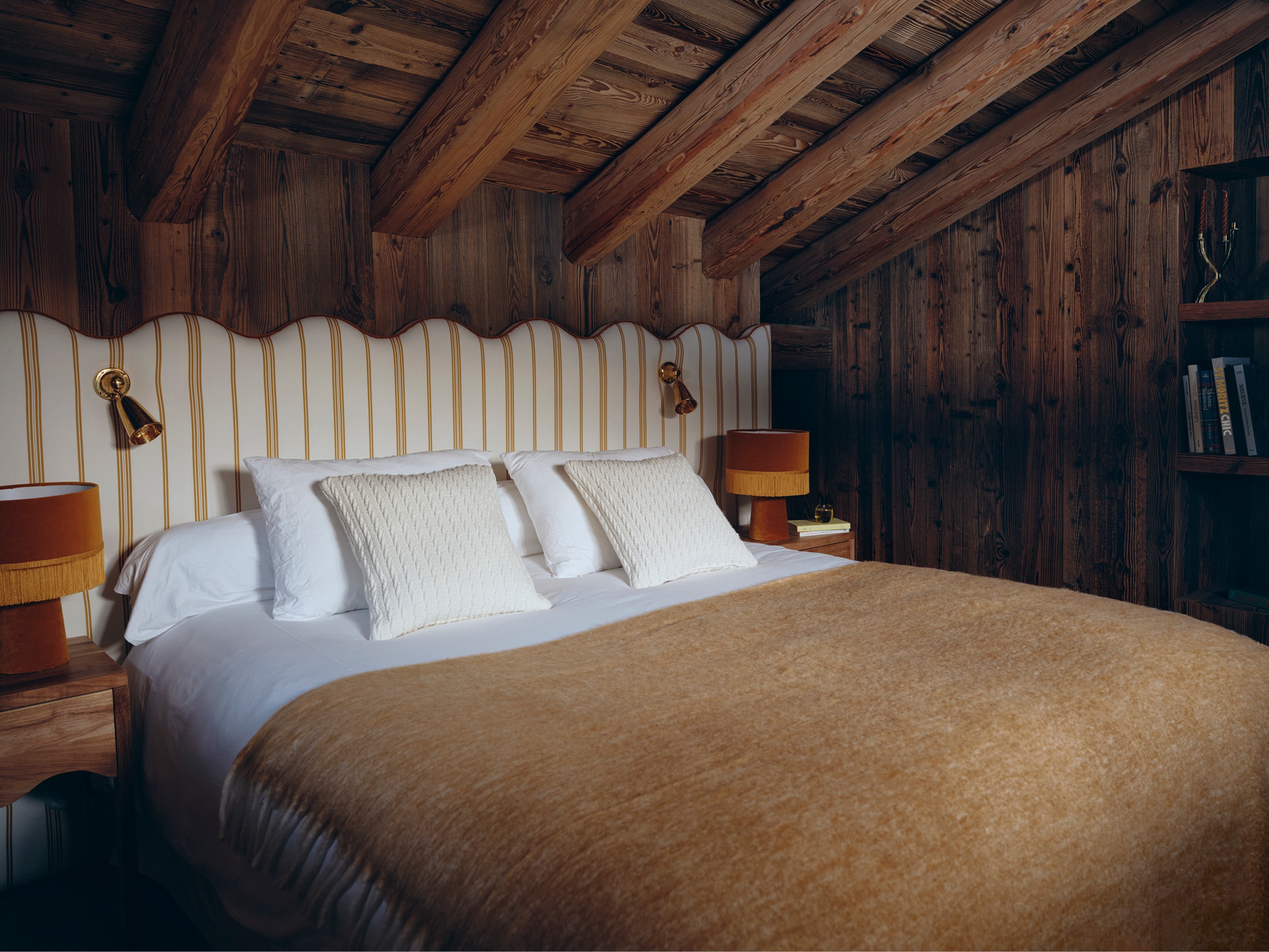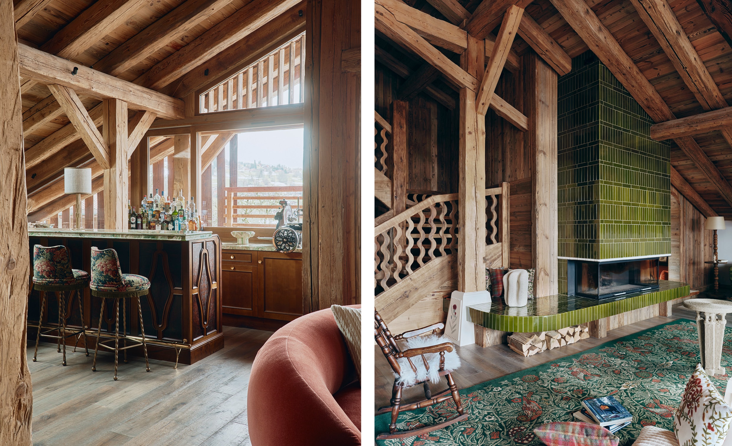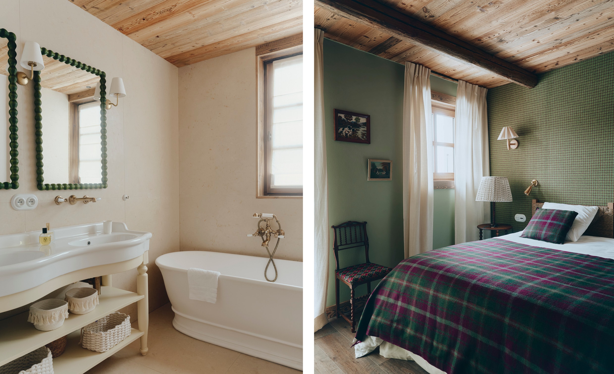 Elke slaapkamer heeft een uniek karakter: op maat gemaakte bedhoofden met stoffen van Dedar, Gaston y Daniela en Schumacher, gecombineerd met handgemaakte kasten en keramische lampen. Badkamers zijn uitgevoerd met Selina-steen en meubelstukken van Bleu Provence of Didier Villancher, waarbij het natuurlijke materiaal de serene esthetiek van het chalet onderstreept. Accessoires, texturen en kleurkeuzes, van tartans tot broderieën, creëren een subtiele gelaagdheid, waardoor het huis een uitnodigend en tijdloos toevluchtsoord vormt voor een jong, gastvrij gezin.
