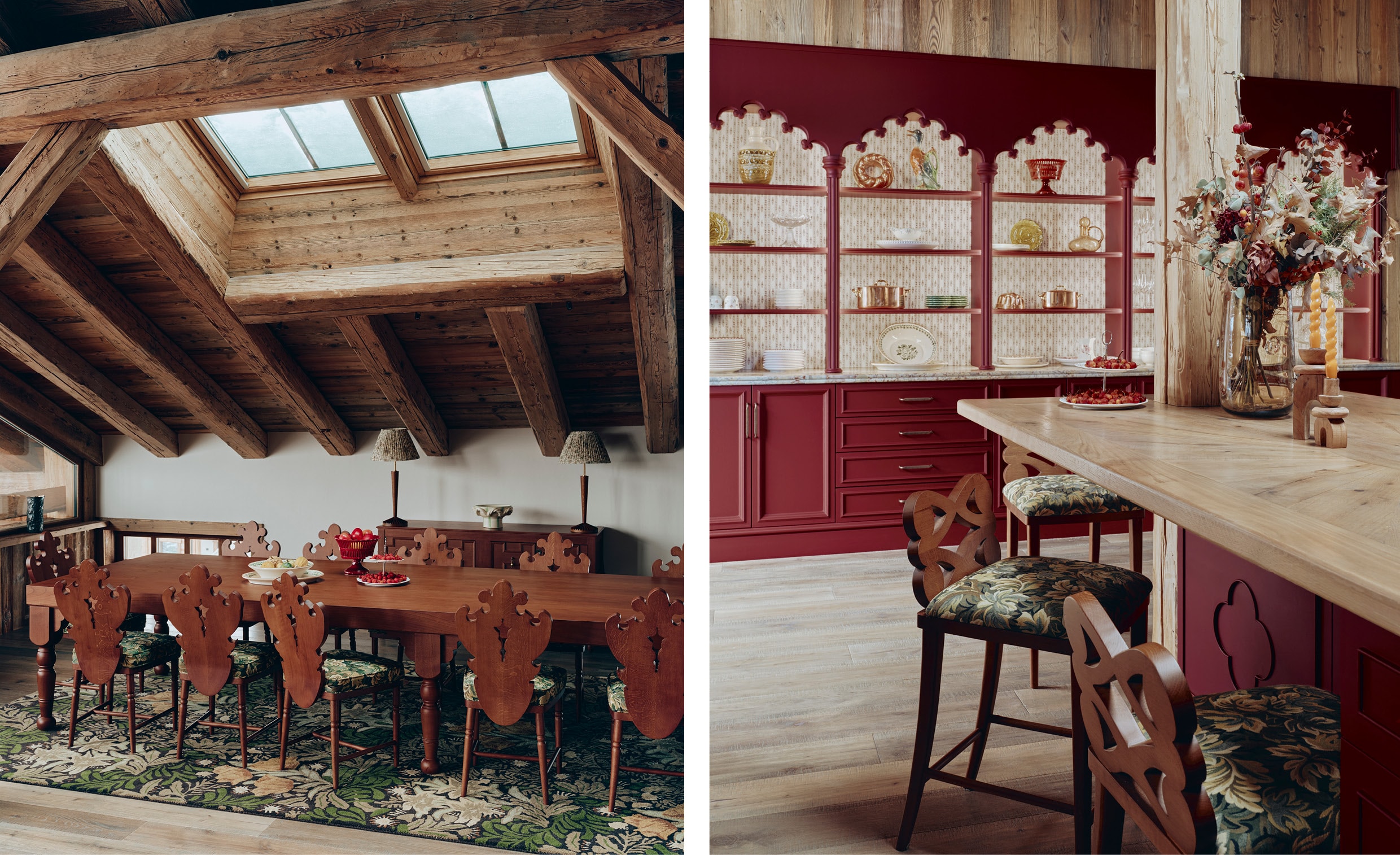 In de centrale leefruimte vormen een op maat gemaakte faience haard, een mohairstofbank van Pierre Frey en subtiele kussens van Mulberry en Schumacher een sfeer van ingetogen luxe. De houten balkenconstructie is zorgvuldig gerestaureerd, terwijl op maat gemaakte tafels en stoelen de ruimte verankeren in ambachtelijke traditie. De eetkamer is voorzien van een Morris & Co-tapijt en stoelen met jacquardstoffen van Antoine l’Albiousse, gecombineerd met een op maat gemaakt vaisselier en keukenmeubel van Didier Villancher, waarmee functionaliteit en verfijning naadloos samenvloeien.