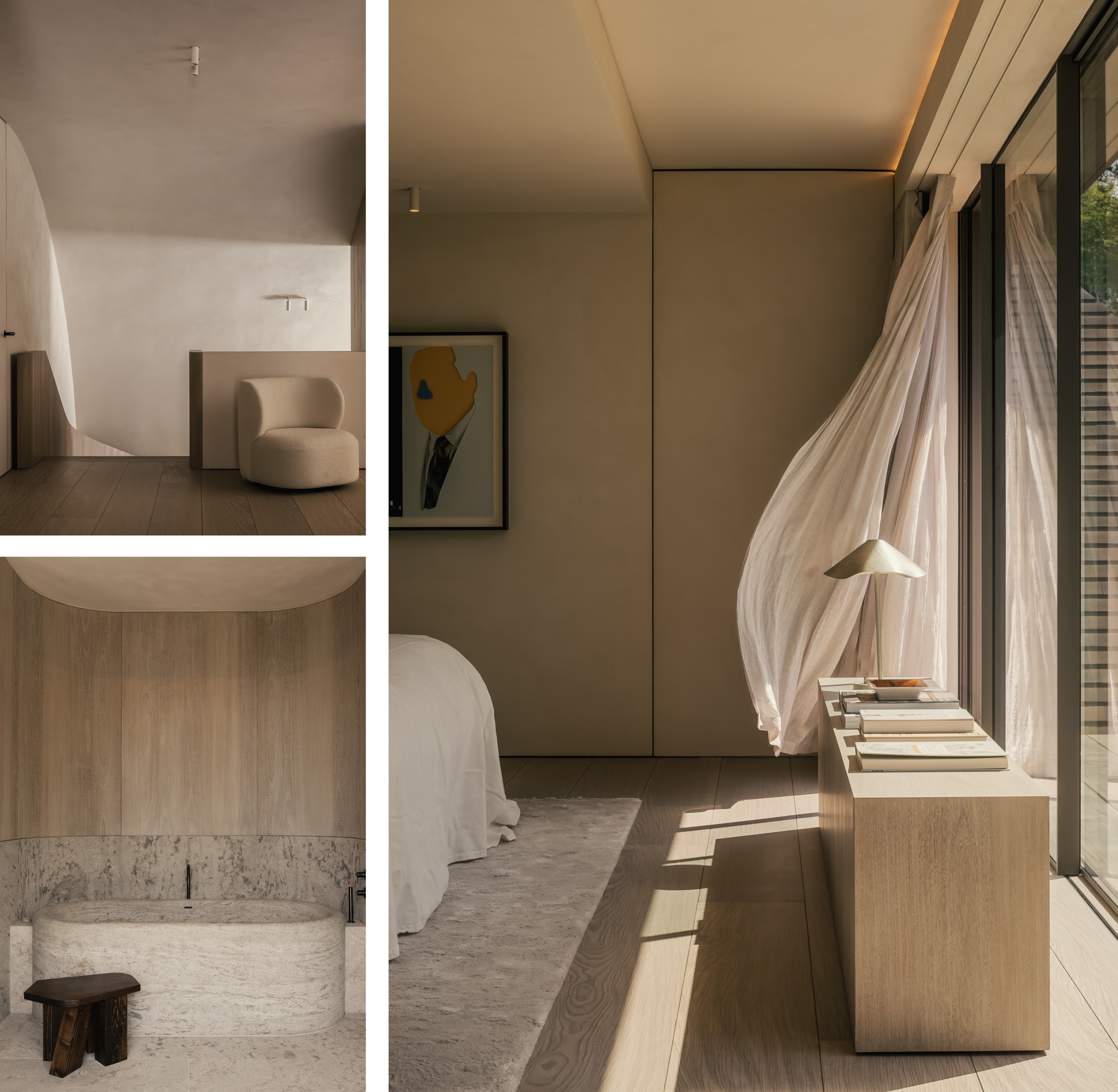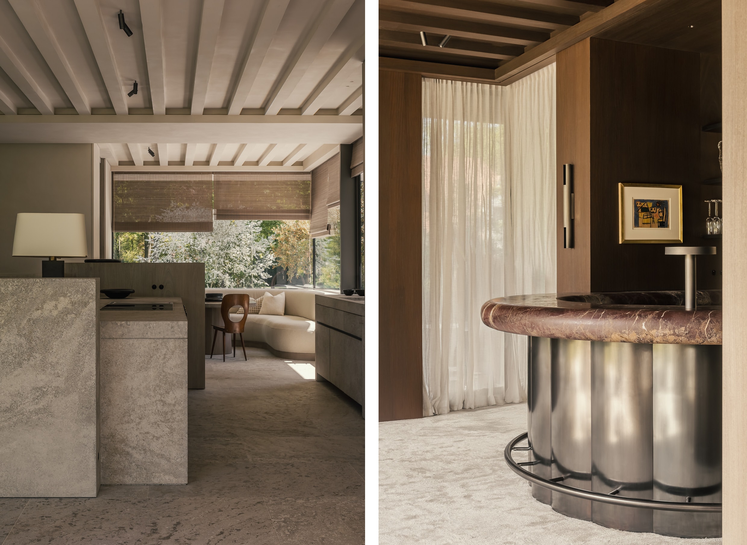 VC House in Knokke is een hedendaagse woning die, net zoals een schilderij, uit zorgvuldig gekozen lagen bestaat. Het spel tussen natuursteen, hout, glas en rode tegelpannen vormt niet alleen de architecturale identiteit van het huis, maar ook de manier waarop het zich in zijn omgeving nestelt. Aan de ene zijde rust een bos, aan de andere opent zich een golfterrein dat zich kilometers ver uitstrekt. De architectuur speelt nauwgezet in op die dualiteit: het huis is tegelijk open en beschuttend, royaal en ingetogen, transparant en besloten. Het hotelgevoel waar de bewoners naar zochten, loopt door in elk detail van de ruimtelijkheid en de materialiteit.