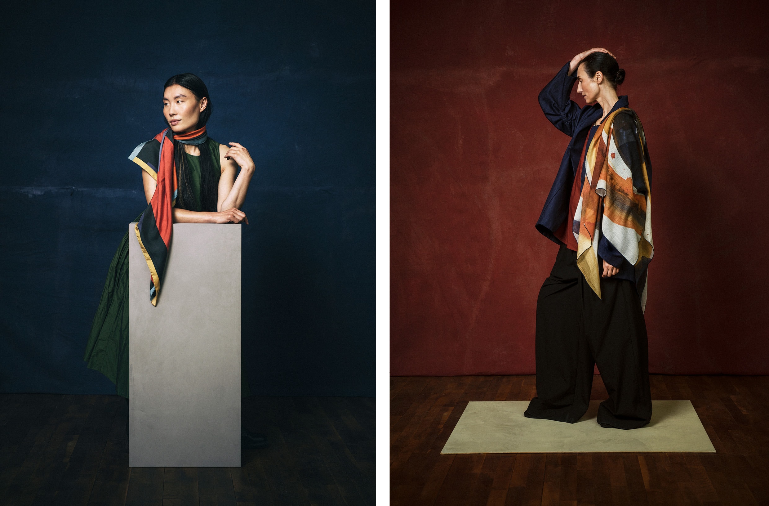 Andere hoogtepunten zijn Dot Wade’s verstilde Division in Davy’s Gray, opgebouwd uit tonale kasjmierlagen; Jörg Bräuers gespiegeld fotografisch landschap van Capri in Lithologie #63; en Naomi Frears’ speelse, geometrische Socket in primaire kleuren. Murray draagt ook Etched #1 bij, een subtiele monochrome bonsaischaduw, en Ember, een dramatische zijden sjaal in diepe bordeaux florale tinten. Schrijver Ross Klavan keert terug met Brief Encounters – Paris, een geestige stedelijke vertelling in schrift over rood zijde, terwijl Rouget haar schilderachtige Intonation-reeks uitbreidt met Intonation 03 in een wol-kasjmiermix.