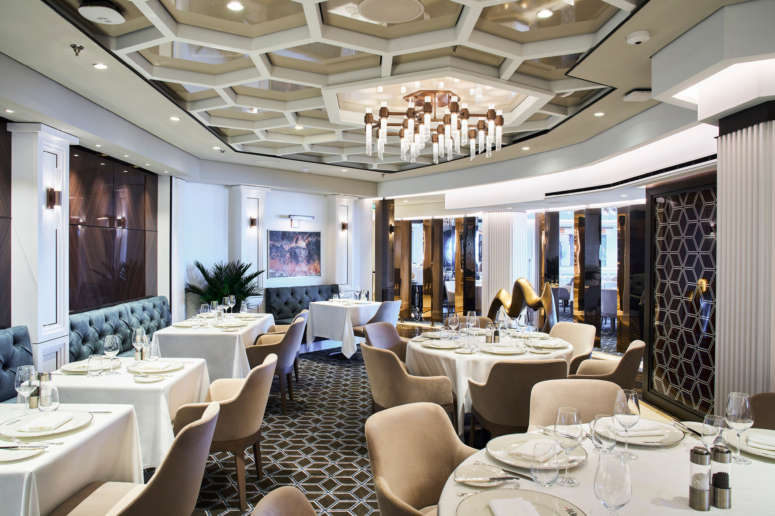Fil Rouge voelt meteen anders aan dan Emporium. Hier is het intiemer en verfijnder, maar nog steeds even indrukwekkend. Strakke witte muren, zeshoekige vormen en zorgvuldig gekozen kunstwerken zorgen voor een fijne sfeer. Op het menu staan delicatessen zoals tonijntataki en desserts die smelten op je tong, van soufflés tot chocoladecreaties met een vleugje Cointreau. Bij Fil Rouge stap je even in een andere wereld, waar elk gerecht zorgvuldig is bereid en je op je gemak kan genieten van elke hap.