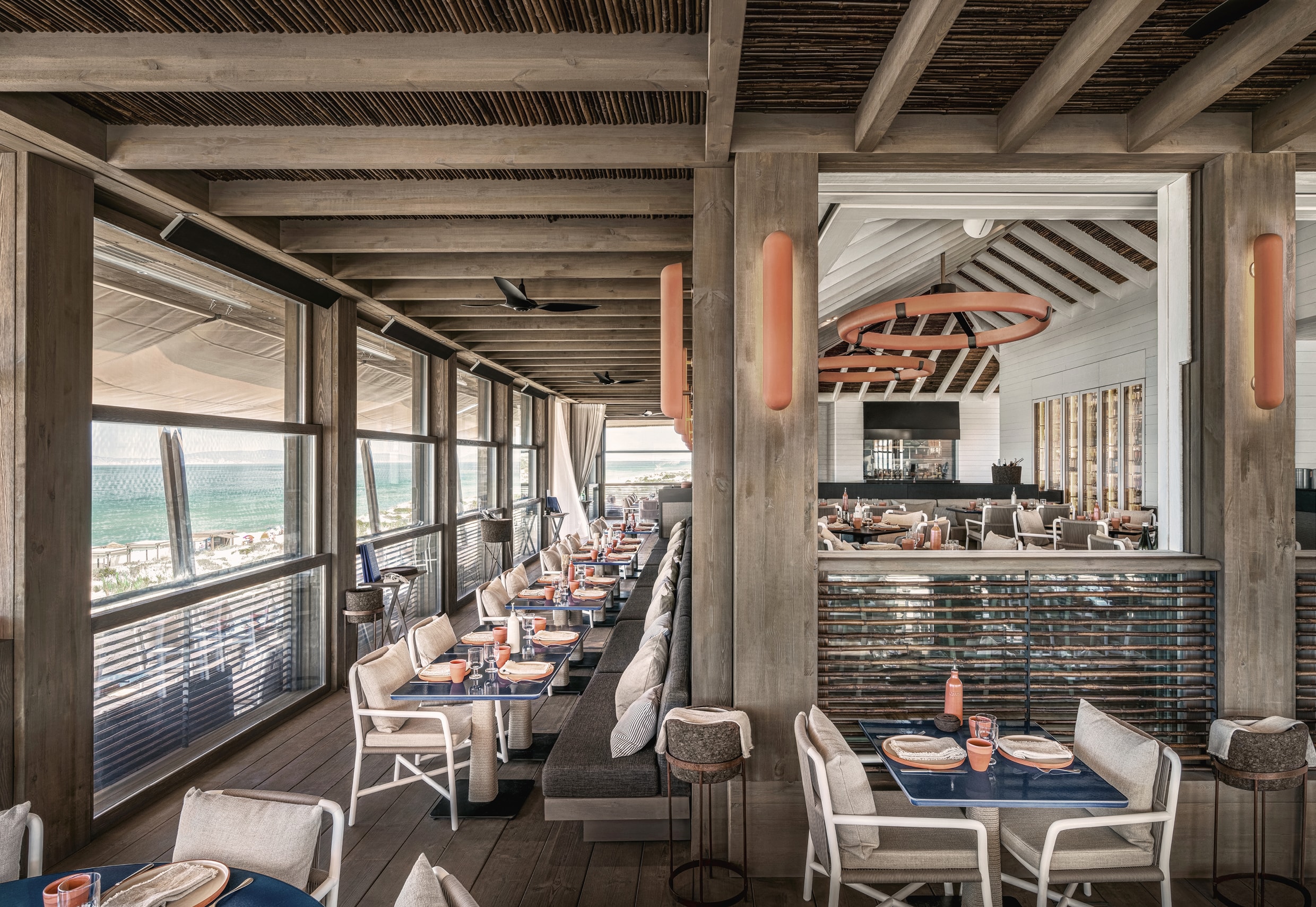 Stap je het restaurant binnen, dan ontvouwt zich een verrassende binnenwereld, levendig en warm. Witte wanden bekleed met hout, plafonds van riet, en accenten in terracotta en intens blauw roepen een sfeer op die tegelijk mediterraan en kosmopolitisch aanvoelt. Het interieur is luchtig, de indeling doordacht: elk zitje biedt zicht op de oceaan, elke hoek ademt comfort en elegantie.