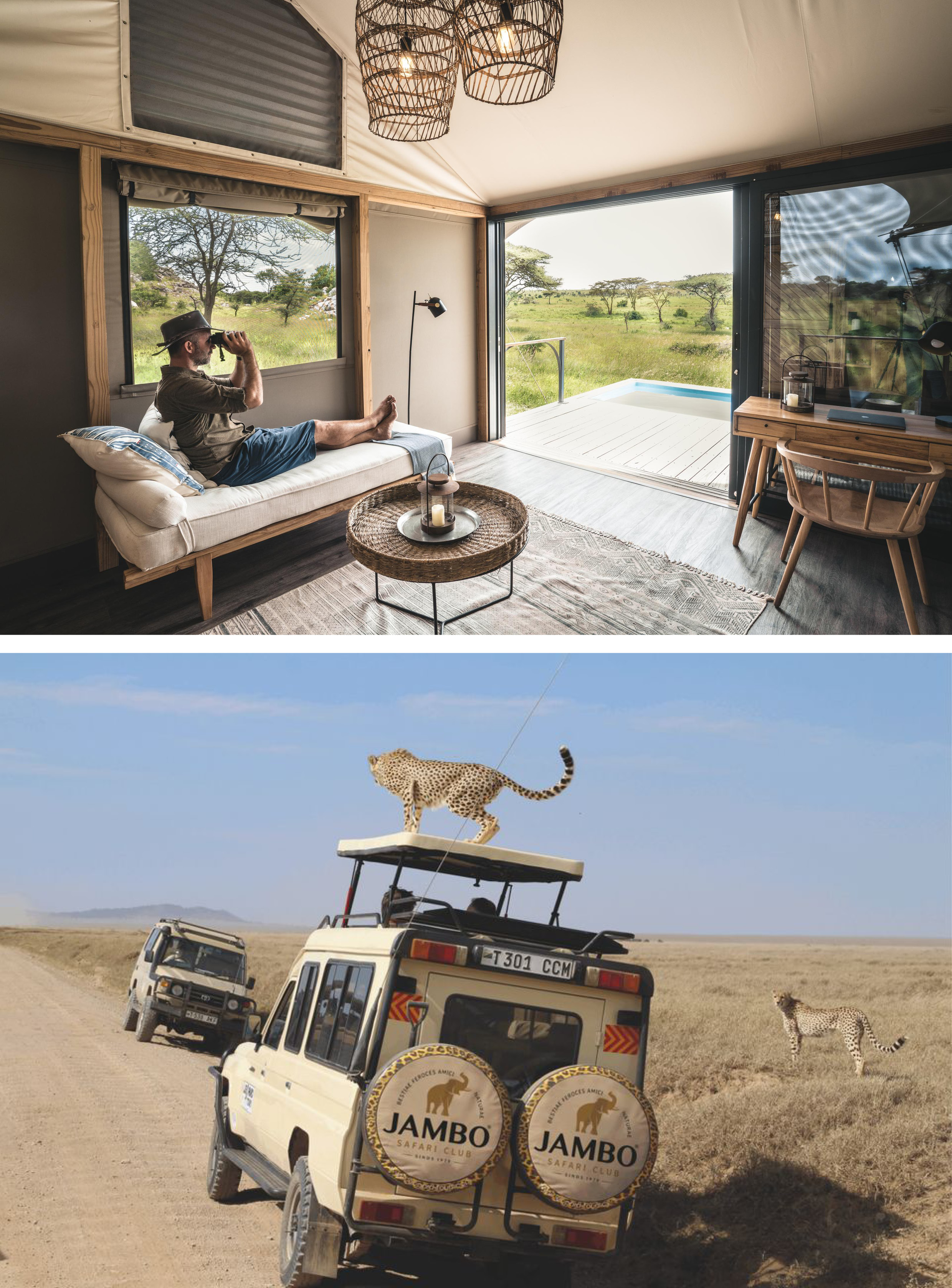 Een tented camp zoals Jambo Safari Club ze aanbiedt, heeft weinig gemeen met traditioneel kamperen. De tent fungeert als een volwaardige hotelkamer, met comfortabele luxebedden en een eigen badkamer. De opbouw bestaat doorgaans uit een centrale ruimte en een gelimiteerd aantal tenten, geplaatst op de grond of op een verhoogd platform. Afhankelijk van het tented camp kan de inrichting variëren van ingetogen tot uitgesproken luxueus, met extra voorzieningen zoals een zwembad of spa. De reisorganisatie biedt tevens mobiele tented camps aan die het ritme volgen van de Grote Trek in Tanzania.