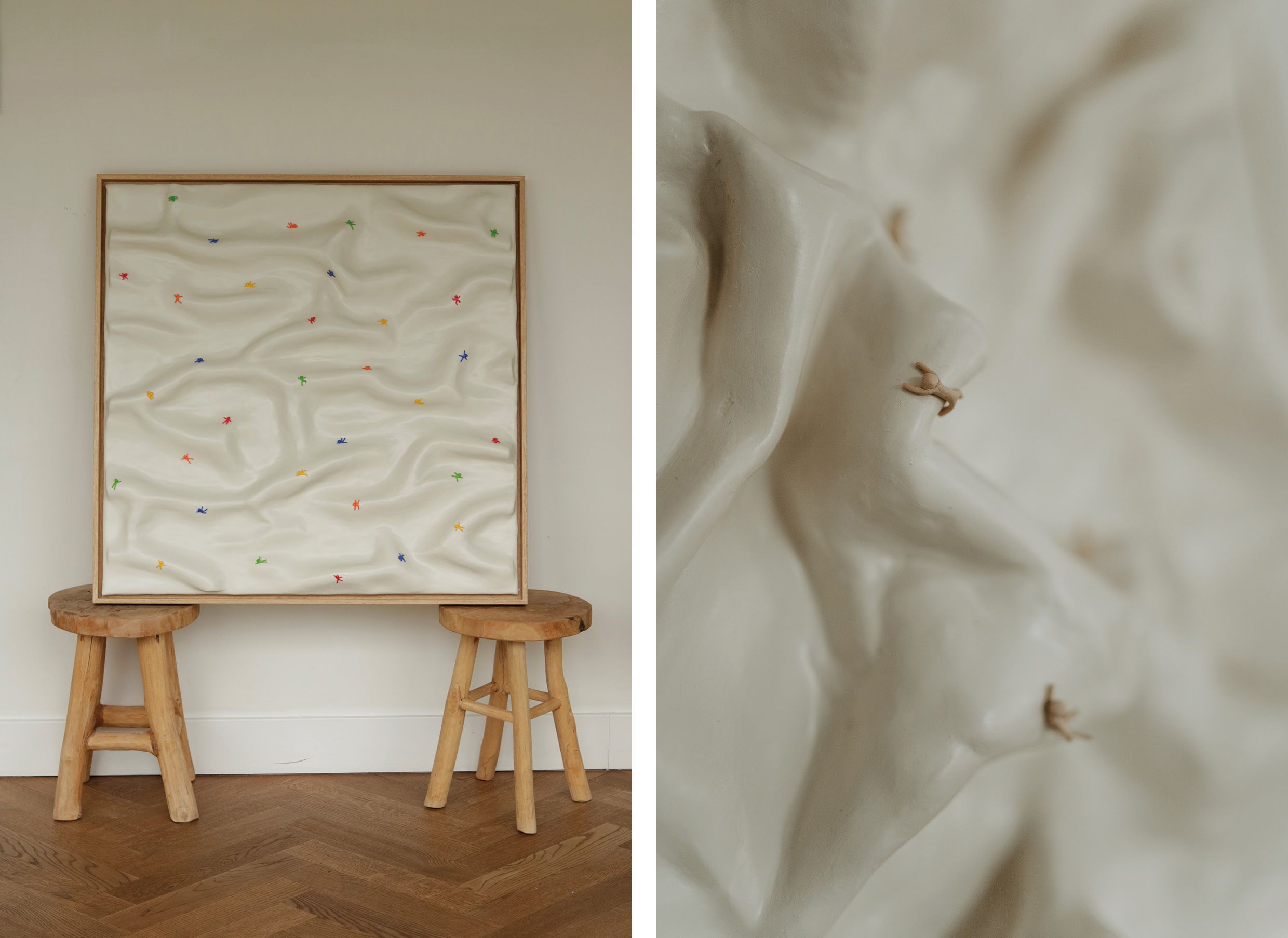 In haar sculpturen zien we abstracte golven en kleine mannetjes die letterlijk over obstakels heen klimmen, elkaar helpen of een nieuwe weg zoeken. Het zijn herkenbare beelden die universele gevoelens oproepen. “Iedereen worstelt weleens met iets, klein of groot”. Toch draagt haar werk nooit zwaarte. De serene kleuren, zachte vormen en het spel van reliëf geven haar creaties een rust die uitnodigt tot reflectie. “Je kan de golven ook positief vertalen naar mooie realisaties die je al verwezenlijkt hebt, de mijlpalen in het leven,” legt ze uit.
